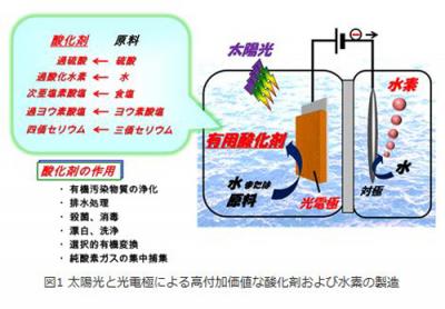 学薬品を製造独立行政法人 産業技術総合研究所は3月6日、多孔質の酸化タングステンなどを積層した半導体光電極を用いて、太陽光エネルギーで水を分解し、水素製造と同時にさまざまな高付加価値の化学薬品を効率良く製造する技術を開発したと発表した。 太陽光エ…