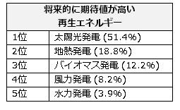 次に、「将来的に期待値が高い再生エネルギー」の問いには、「太陽光発電(51.4%)」が大きな支持を得ており、2位には「地熱発電(18.8%)」、3位には「バイオマス発電(12.2%)」という結果となりました。