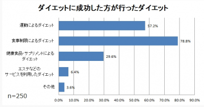 『ダイエットの方法』については、成功・失敗の両者ともに「食事制限」を取り入れていた人が最も多いことが分かったが、次点の方法については回答が分かれ、成功者は「運動によるダイエット(57.2%)」、失敗者は「健康食品、サプリメントによるダイエット(69.8%)」を挙げていた。