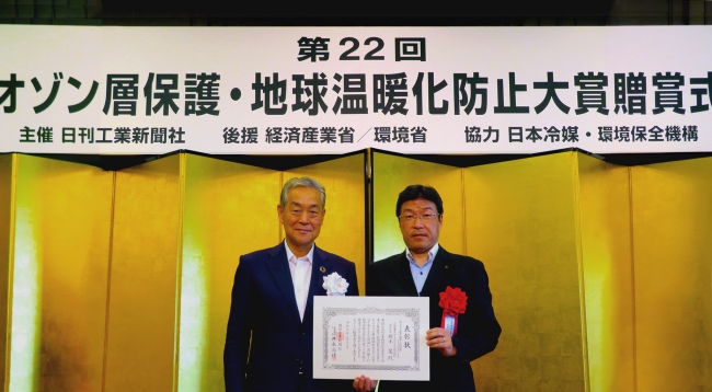 「CO2自然冷媒採用 冷凍冷蔵コンデンシングユニット・C-puzzle」で、三菱重工冷熱株式会社との共同受賞を果たした。同製品は食品など、冷凍冷蔵倉庫の冷却熱源の装置で、冷媒に地球温暖化係数が1のCO2を採用。これによりオゾン層を破壊することなく、温暖化抑制にも大きく寄与する。